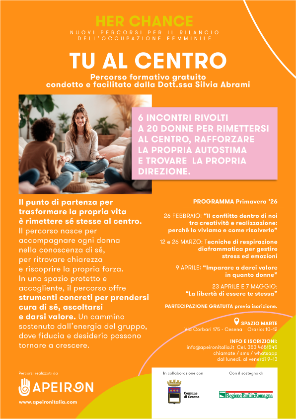 A partire da giovedì 26 febbraio prende avvio a Cesena il percorso formativo gratuito ‘Tu al centro’, promosso da Apeiron ODV in collaborazione con il Comune e realizzato grazie al contributo della Regione Emilia-Romagna. L’iniziativa è rivolta a 20 donne che desiderano rafforzare la propria autostima, rimettersi al centro della propria vita e ritrovare maggiore consapevolezza e direzione personale.