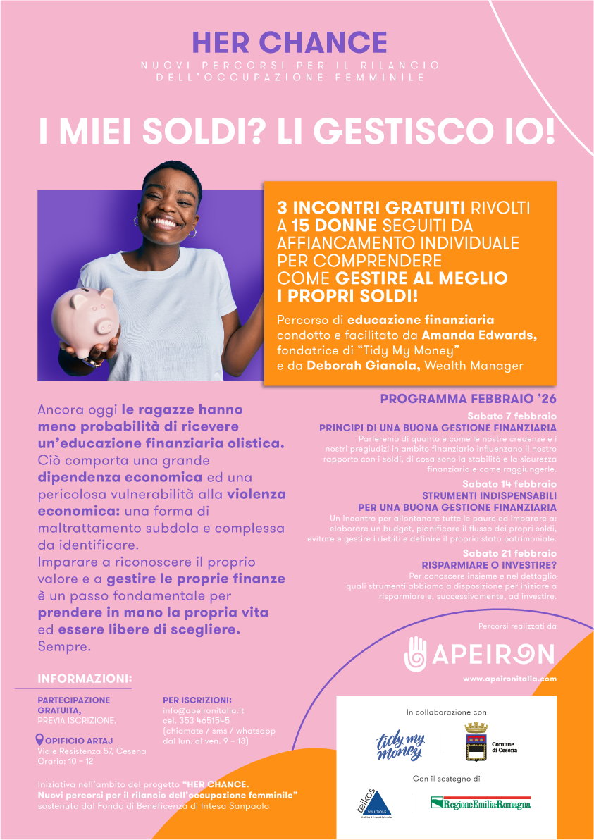 Migliorare la consapevolezza economica delle donne e rafforzarne l’autonomia finanziaria: è questo l’obiettivo di ‘I miei soldi? Li controllo io!’, percorso gratuito di educazione finanziaria promosso da Apeiron ODV nell’ambito del progetto ‘Her Chance – Nuovi percorsi per il rilancio dell’occupazione femminile’. L’iniziativa nasce dalla consapevolezza che, ancora oggi, le donne hanno minori probabilità di accedere a un’educazione finanziaria completa e strutturata, una condizione che può tradursi in dipendenza economica e in una maggiore vulnerabilità, anche rispetto alla violenza economica.