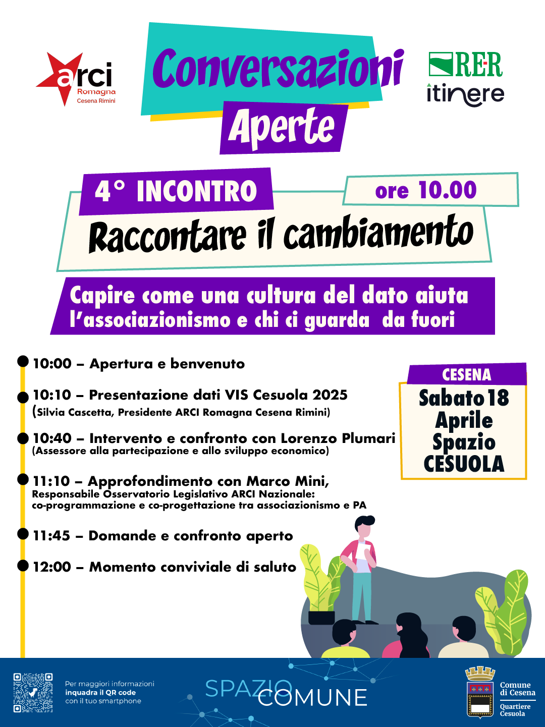 Incontro “Raccontare il cambiamento. Capire come una cultura del dato aiuta l’associazionismo e chi ci guarda da fuori”, sabato 18 aprile, ore 10 presso Spazio Cesuola. Vedi volantino
