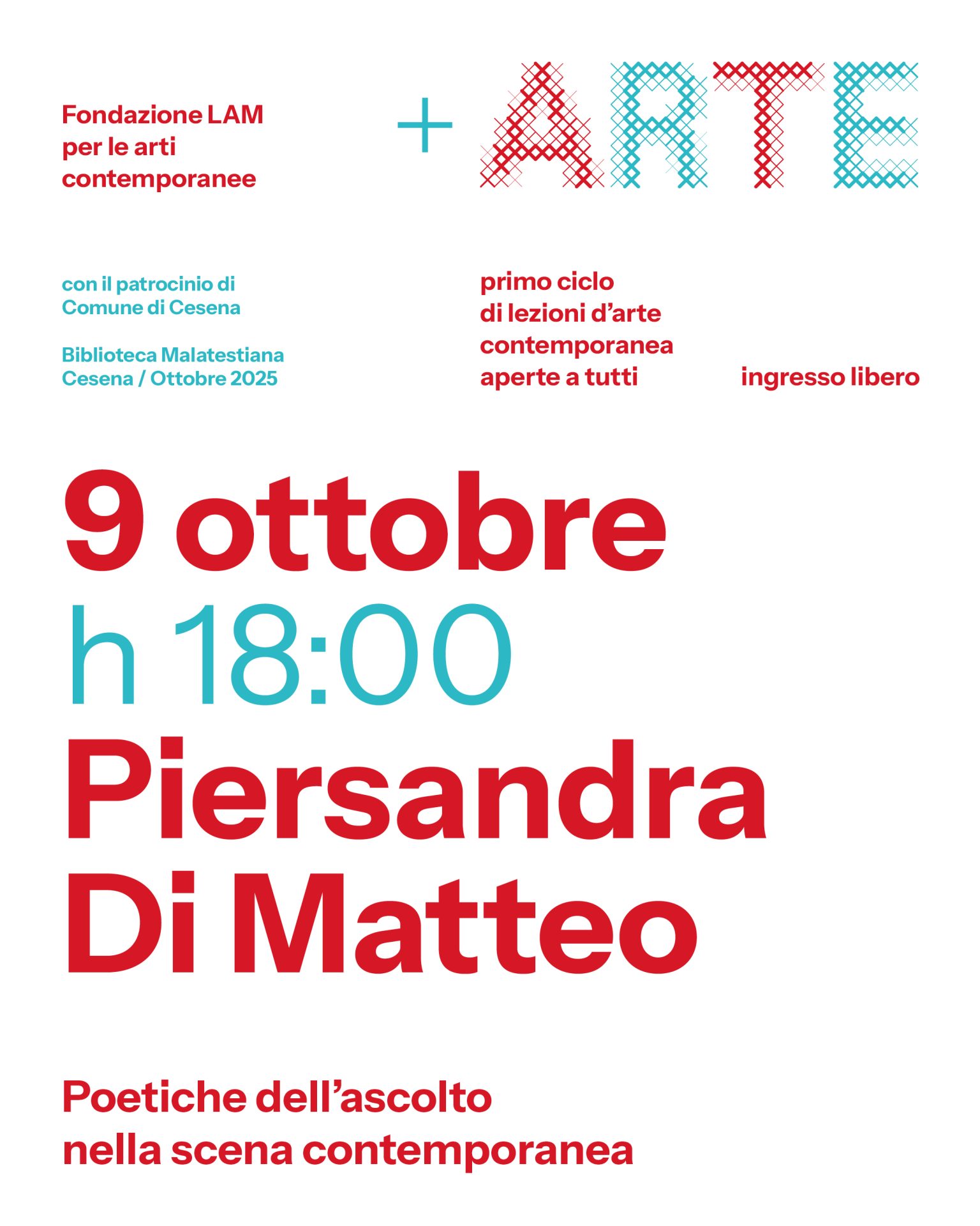 Giovedì 9 ottobre, alle ore 18:00, nell’Aula Magna della Biblioteca Malatestiana, si terrà il secondo appuntamento di +ARTE, il ciclo di incontri pubblici dedicato alle arti contemporanee e a cura Pier Luigi Sacco, con ingresso libero e gratuito. +ARTE rappresenta uno dei progetti principali di questa visione: un ciclo di quattro incontri gratuiti che si svolgono ogni giovedì di ottobre (2, 9, 16, 23) dalle 18:00 alle 20:00. Protagonista del secondo appuntamento, il 9 ottobre, sarà la drammaturga e curatrice Piersandra Di Matteo, con una lezione intitolata “Poetiche dell’ascolto nella scena contemporanea”.