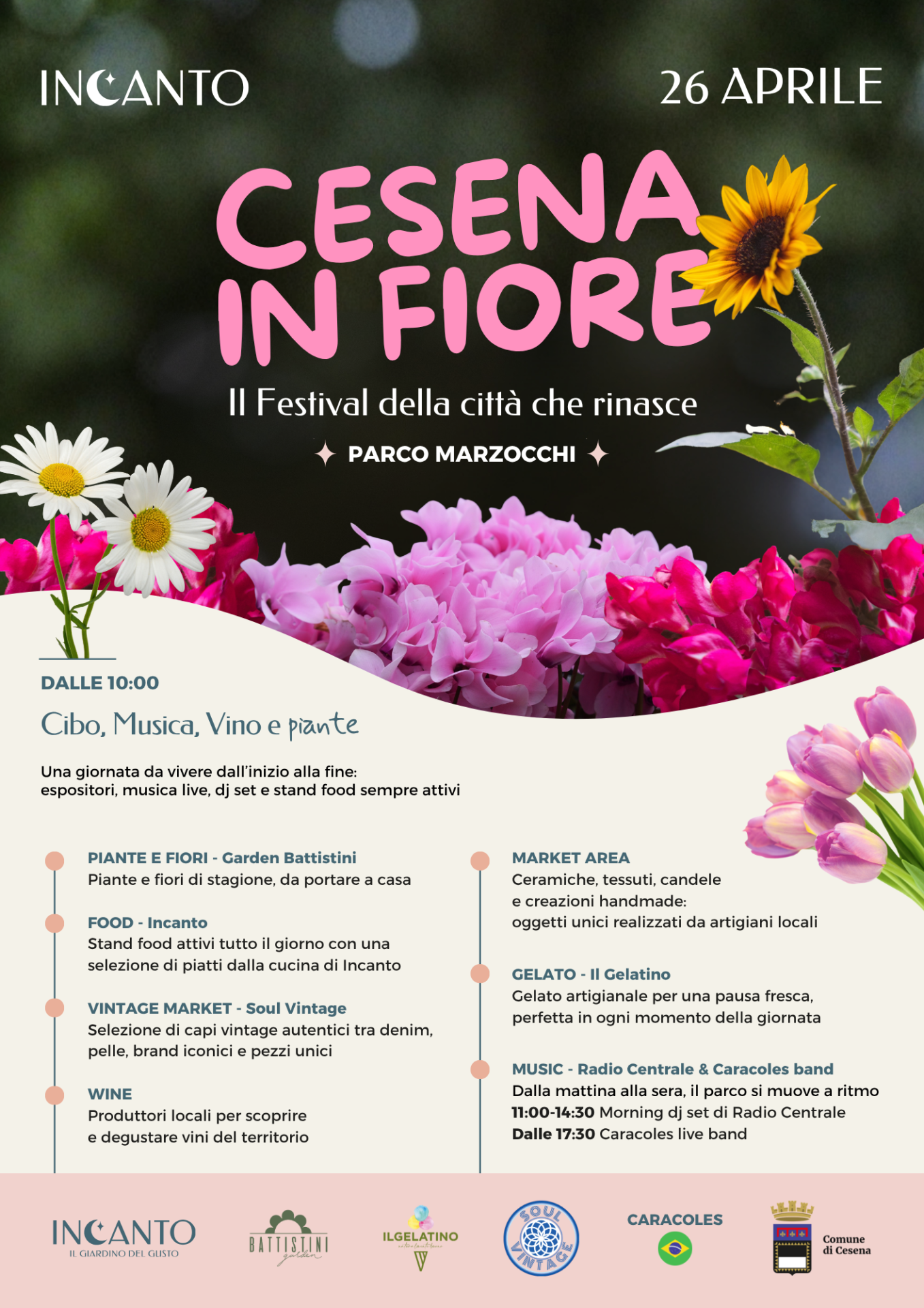 “Cesena in Fiore – commenta l’Assessore allo Sviluppo economico Lorenzo Plumari – è l’iniziativa che accompagna la nostra città verso la primavera ed assume un valore centrale anche grazie al grande impegno di Roberta Basile e di tutto lo staff di ‘Incanto’ che fanno vivere il parco Fornace Marzocchi attraverso una proposta quotidiana di qualità che si sviluppa di volta in volta attraverso iniziative di intrattenimento ed eventi solidali. Dopo il grande successo ottenuto in centro dal Fritz Collective Fest, ci prepariamo a vivere questa festa che si terrà in una cornice naturale bella, per tutti, all’indomani della festa della Liberazione. Eventi come questo rappresentano anche un tassello fondamentale di una visione più ampia: ripensare e far vivere in modo nuovo i nostri spazi pubblici, dalle strade ai parchi, trasformandoli in luoghi di incontro, relazione e comunità. Restituire questi spazi ai giovani, alle famiglie e agli anziani significa rafforzare il senso di appartenenza e costruire una città più viva, inclusiva e partecipata. È una direzione chiara, che vogliamo continuare a perseguire con determinazione”.