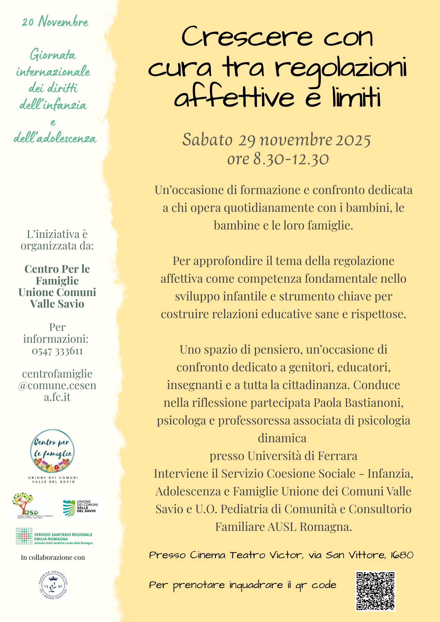 In una settimana dedicata ai diritti dell’infanzia e dell’adolescenza, il Centro per le Famiglie dell’Unione dei Comuni Valle Savio propone ‘Crescere con cura tra regolazioni affettive e limiti’, una mattinata di formazione e confronto rivolta a genitori, educatori, insegnanti e cittadinanza. L’evento si svolgerà sabato 29 novembre, dalle ore 08:30 alle ore 12:30 al Cinema Teatro Victor (via San Vittore, 1680).