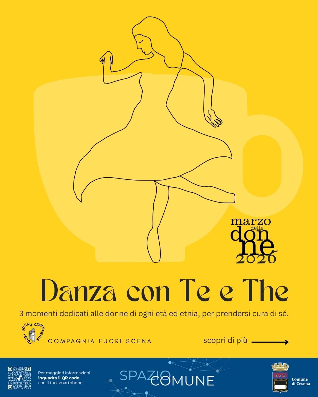 Prosegue il programma del ‘Marzo delle Donne 2026’ promosso dall’Amministrazione comunale di Cesena e dal Forum sui generis e ufficialmente avviato sabato 28 febbraio. Tra i 40 eventi proposti ci sono anche le iniziative a cura della Compagnia Fuori Scena, che ha inaugurato il mese con il primo appuntamento di ‘Danza con Tè’, andato in scena domenica 1° marzo.