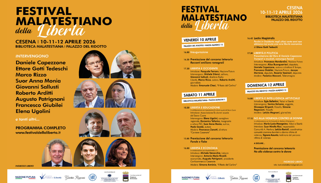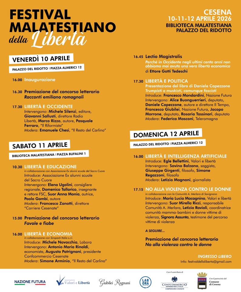 Libertà e Politica e la presentazione del libro di Daniele Capezzone “Trumpisti o muskisti, comunque fascisti”. Dopo l’introduzione di Francesco Mondardini (Nazione Futura) intervengono Alice Buonguerrieri (deputata), Daniele Capezzone (autore e Direttore de Il Tempo), Francesco Giubilei (Nazione Futura), Jacopo Morrone (deputato), Rosaria Tassinari (deputata) con la moderazione di Federica Mosconi (Teleromagna).