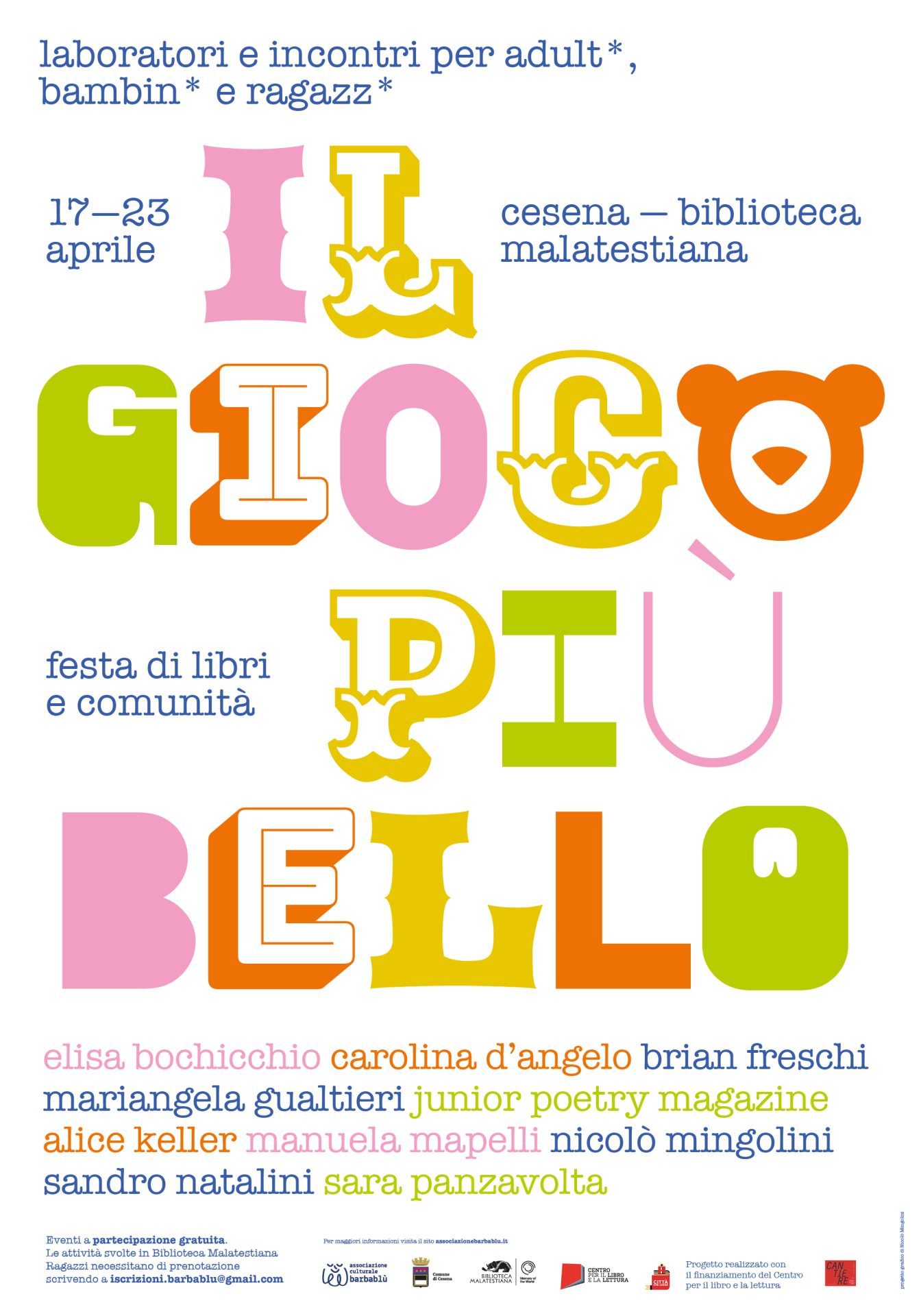 Si avvicina ‘Il gioco più bello’, la festa di libri e comunità organizzata dall’Associazione Culturale Barbablù in collaborazione con il Comune di Cesena e la Biblioteca Malatestiana. Il progetto è realizzato con il finanziamento del Centro per il libro e la lettura e rientra fra le azioni di ‘Meno male che il tempo era bello’.