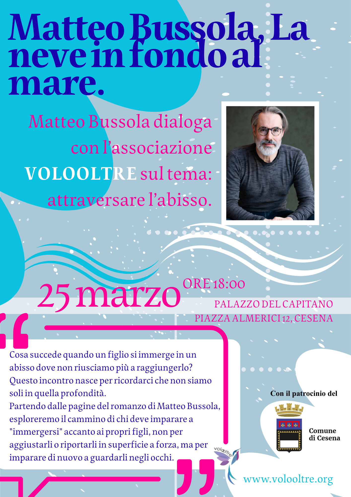 Matteo Bussola dialoga con l'Associazione Volo Oltre. L'appuntamento è nella sala Sozzi del palazzo del Ridotto per mercoledì 25 marzo, ore 18.00. L'autore presenterà il romanzo 'La neve in fondo al mare.'
