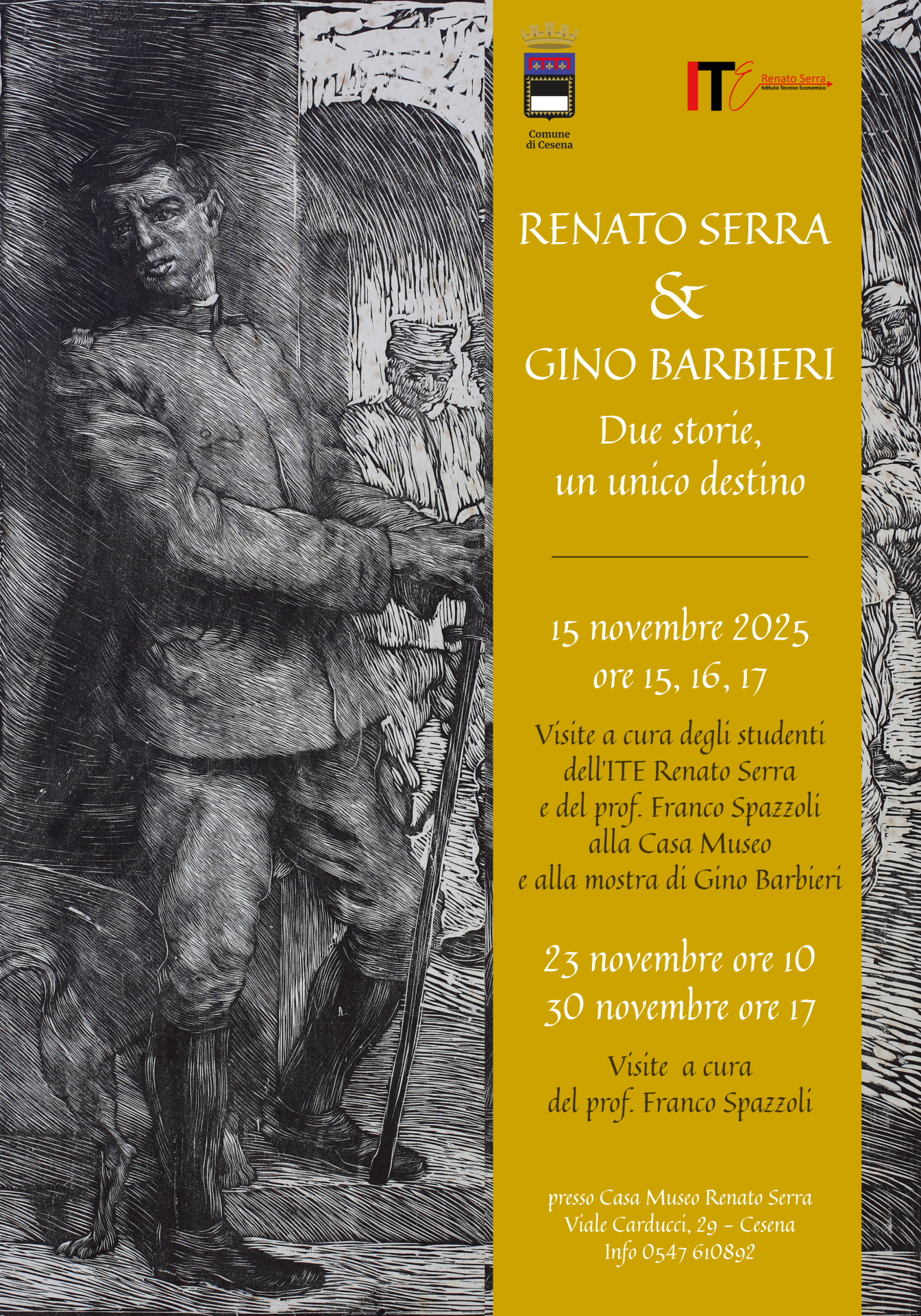 Nel corso del pomeriggio, alle ore 15:00, 16:00 e 17:00, gli studenti dell’Istituto Tecnico/Economico ‘Renato Serra’, indirizzo Turistico, saranno a disposizione per guidare le visite alla casa museo di viale Carducci 29. Con loro anche il professore Franco Spazzoli, che si soffermerà sulla figura di Barbieri e sulla sua vicenda personale. Il professore Spazzoli guiderà i visitatori alla scoperta di Gino Barbieri anche nelle date di domenica 23 novembre alle ore 10:00 e di domenica 30 novembre, alle ore 17:00.