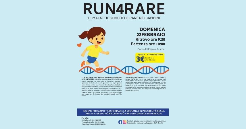 Per accendere i riflettori su questa realtà e offrire un aiuto concreto nasce ‘RUN4RARE’, la camminata e corsa solidale in programma domenica 22 febbraio a Cesena, con partenza da piazza del Popolo. L’evento, patrocinato dal Comune di Cesena e dall’Ausl Romagna, non è competitivo ed è aperto a tutti: bambine a bambini, adulti e famiglie.