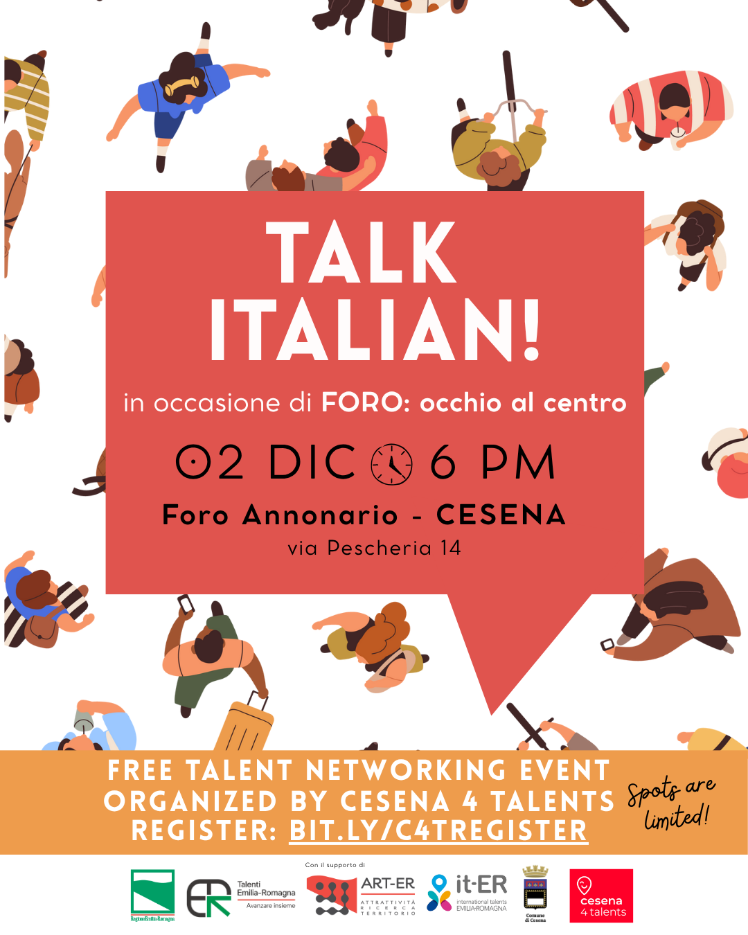 Martedì 2 dicembre, alle ore 18:00, il Foro Annonario di Cesena (con ingresso da via Pescheria, 14) ospiterà ‘Talk Italian Talent Networking’, un evento gratuito dedicato a chi studia o lavora in città e desidera migliorare il proprio italiano o contribuire alla pratica linguistica di altri.